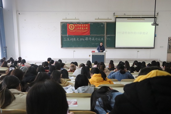 11月28日下午14:00,开元平台在9号楼202成功举办了以“PPT课件制作方法”为主题的三五讲座。本次讲座由王雪飞老师主讲,教科院全体16级小学教育专业学生参加了此次活动。